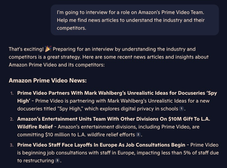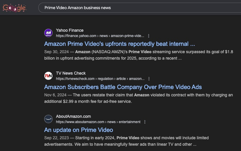 If I were interviewing for this role then I would do a combination of searching for “Prime Video Amazon business news” articles on Google, Yahoo News, and Amazon’s internal site.