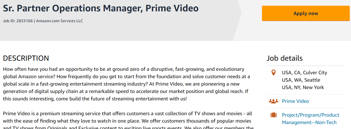 Understand the Team: Particularly at larger companies, take time to research the specific team. Review the job description you applied to and it will say the team in the title or the details. For example, the Amazon job description below is for a team on Prime Video.