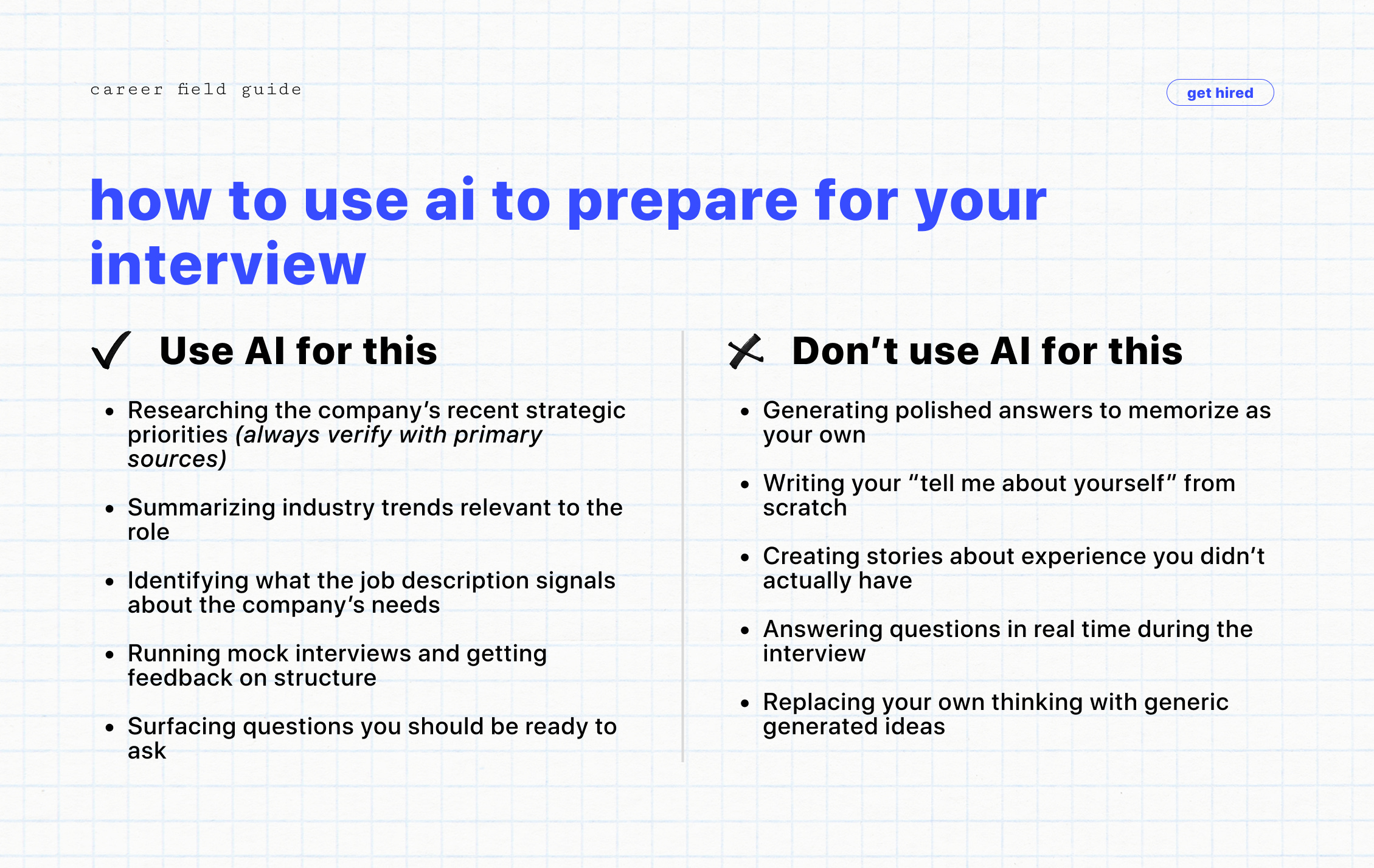 The lazier version is generating polished answers to likely interview questions and memorizing them. That works right up until your interviewer does what every good interviewer does and pushes on a decision, asks you to go deeper, or follows a thread you didn’t expect. If the answer came from AI and not from your actual experience, you’ll go quiet at exactly the wrong moment.