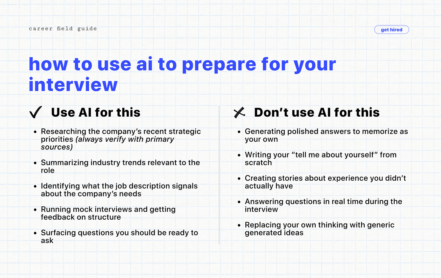 The rule is simple: use AI to understand the company and its context. Use your own thinking to answer questions about what you’ve done and why. Those are the only answers that hold up under pressure because they’re the only ones that actually belong to you.