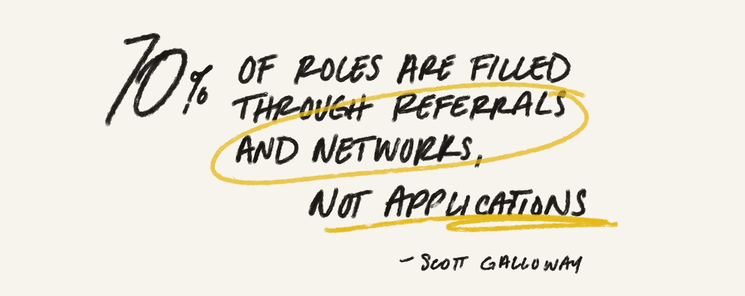 As Scott Galloway illustrates above, most hiring decisions are effectively made before the job posting ever goes live. 70% already have an in with the hiring team and the job posting is often just the compliance layer on top of a decision that’s already forming.