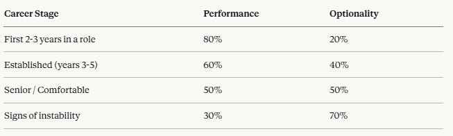 When you’re established and maturing in your career, you shift to 60/40, then 50/50. The shift to 50/50 isn’t about checking out. It’s about building a career that compounds in two directions at once—one inside your company, one outside of it.