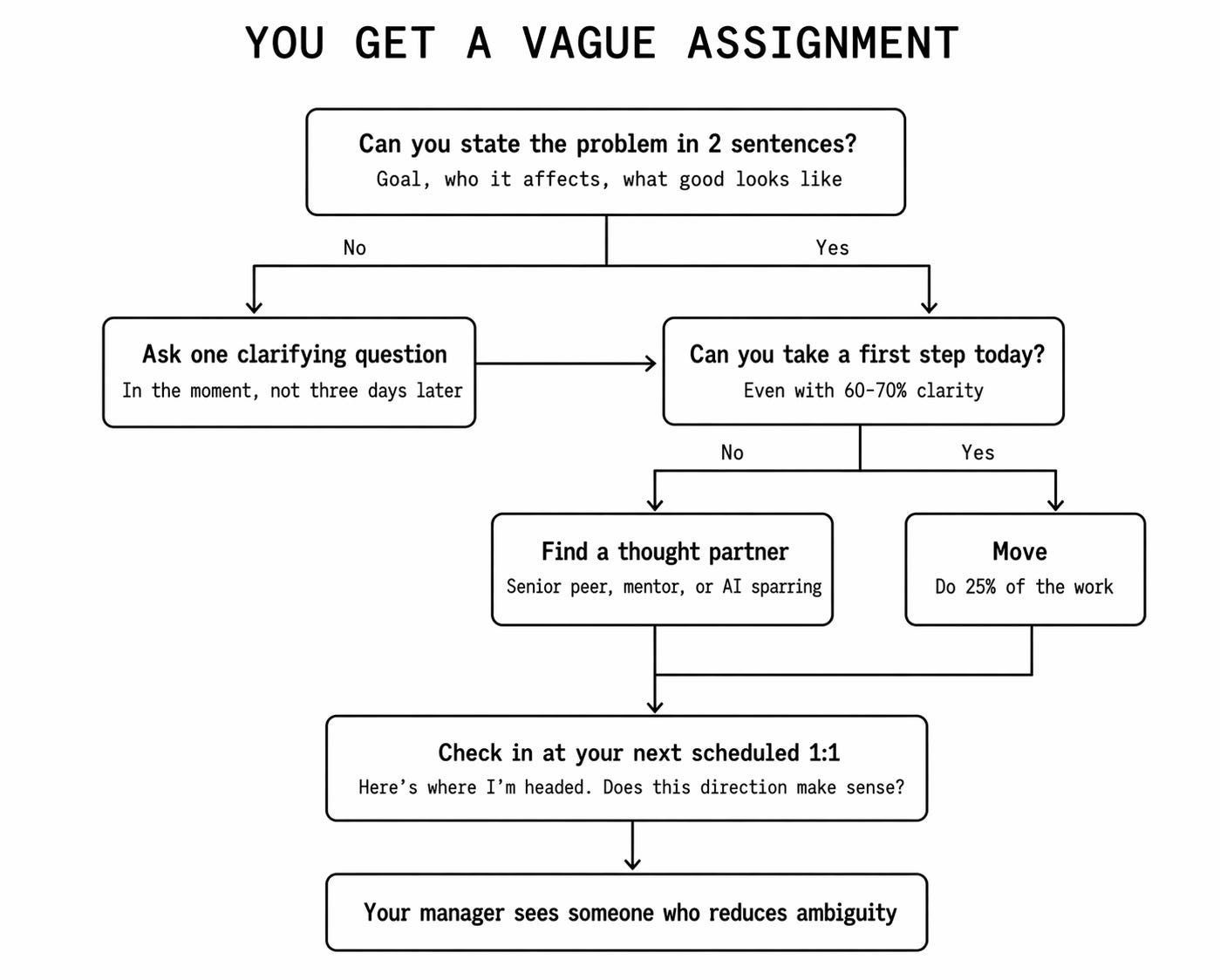 Next time you get a vague assignment, before you ask your first question, write down three things: the problem as you understand it, one assumption you’re making, and a first step you’d take. Bring that to your manager instead of a question. It takes five minutes and it will change how they see you.