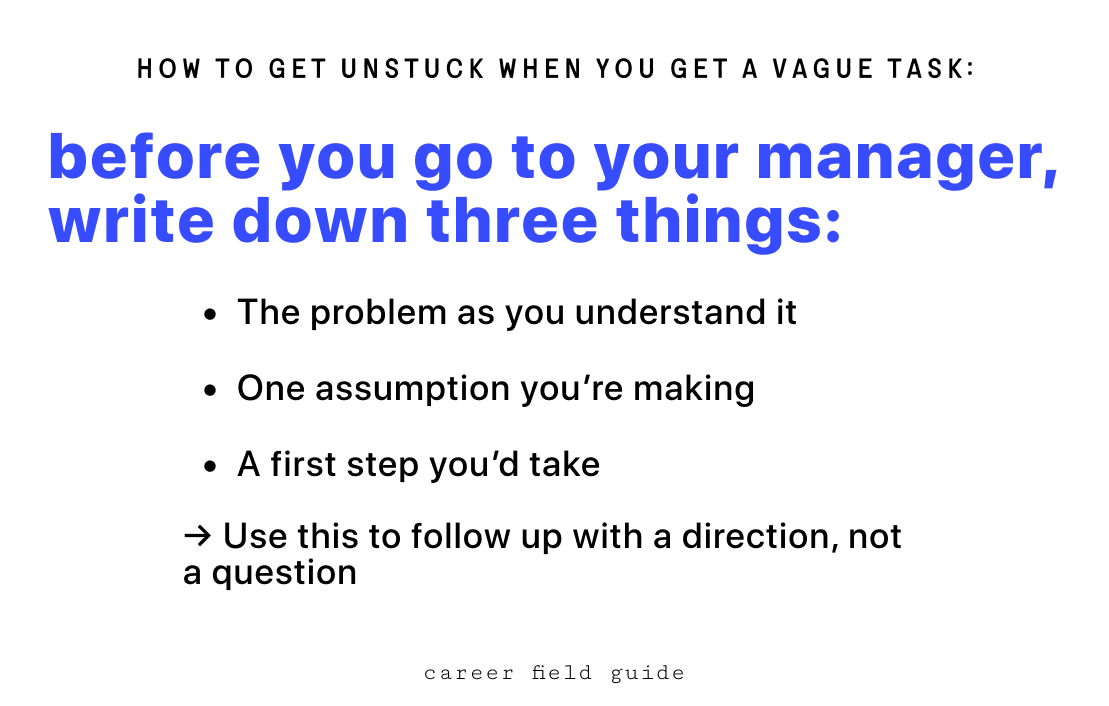Don’t ask for feedback on every micro-decision. Check in once or twice, but not daily or on every detail. If you’re coming back to your manager every day with a new clarifying question, you’re not reducing ambiguity. You’re creating a new kind of it. They start spending their time managing you instead of managing their own work.